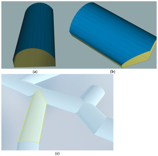 In the cases where the shaft is located in a straight tunnel, the shaft is projected on the plane where the bottom of the tunnel is located, where the center of the projection circle of the shaft is perpendicular to the direction of the tunnel centerline, and the monomer subsegment of the tunnel is divided into two monomer models, as shown in Figure 9a. When the shaft is located in a straight or multi-passage tunnel, the tunnel is divided by the angle bisector formed by the centerline of the tunnel, as shown in Figure 9b,c. In order to achieve the connectivity effect, the joint reconstruction of the arches and shafts at the top of the tunnel is a key problem in axial modeling. First, the connectivity of the shaft at the inflection point of a tunnel is discussed. The modeling method is as follows: