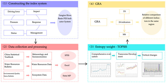 The specific methodological flow (Figure 1) was as follows: firstly, the six-dimensional indicator system was constructed based on the DPSIRM framework, drawing on existing studies. Secondly, there was data collection and processing. The study materials of the YRB, from China Statistical Yearbook, Water Resources Bulletin (2012–2021), the Soil and Hydrological Maintenance Bulletin (2012–2021), and the Ecological and Environmental Quality Status Bulletin (2012–2021), were collected and processed. Thirdly, we conducted a synthesis evaluation of the YRB by entropy weight-TOPSIS. The research team analyzed the horizontal level of development and vertical changes in 11 provinces (municipalities) within the YRB. Fourthly, the degree of impact of different indicators in the same region was compared in conjunction with GRA, since GRA can characterize the correlation between complex factors and does not require a high sample size. Therefore, this paper uses GRA to determine the association between forest condition and FES indicators of YRB to find the subjective association of FES indicators in each region [38].