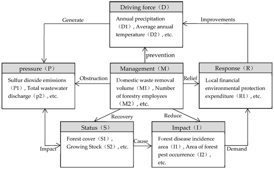 A forest ecosystem is a complex system that contains many natural environmental factors and socio-economic factors. As human activities intensify, harmful interference with forest ecosystems increases, and traditional dynamical models such as the DPSIR model cannot fully reflect the role of human and social factors, nor can they realize the core of the concept of forest ecosystem security, which is highly concerned with human society. To achieve the goal of forest ecosystem security, the interaction and contribution of various factors to forest ecosystem security should be reflected as comprehensively as possible. In this study, the DPSIRM model was introduced to construct the indicator system. The model is based on the original DPSIR model, and the management (M) subsystem module is introduced. Management represents the cost of human initiative in response to the change in environmental conditions. Based on this model framework, the DPSIRM-based forest ecological safety evaluation index was established. The model can reflect the various factors that affect FES, reflecting the interlocking effects of each factor, and helping to analyze the influence mechanism of forest ecological security in China.