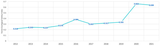 The combined FES score for the YRB improved from 0.218 to 0.638 between 2012 and 2021. The FESI estimates for the YRB for 2012–2021 were 0.218, 0.243, 0.237, 0.276, 0.384, 0.301, 0.317, 0.335, 0.662, and 0.638, respectively (Table 2). Overall, the forest status of the YRB showed an upward trend under small fluctuations (Figure 4), which can be divided into three stages.