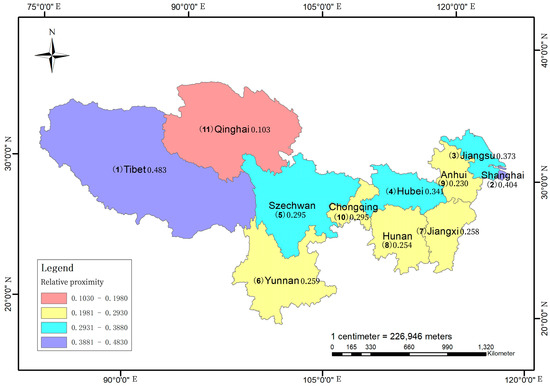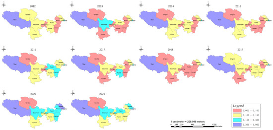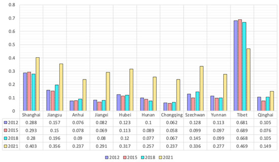 Combined with the entropy weighting results, the relative proximity of each region in the YRB was calculated in 2012, 2015, 2018, and 2021 (Figure 7). Using ArcGIS software, the forest relative proximity index was divided into four classes, and the distribution of evaluation classes in each region of the YRB for the research duration was mapped (Figure 8). The comprehensive forest index of the YRB improved by 192.66% during 2012–2021. The state of forest habitat in the YRB region is improving smoothly. Most of the provinces (cities) have improved, and Tibet has the best forest status. The Shanghai, Szechwan, Hubei, and Jiangsu regions have gradually improved their forest status in recent years. However, the remaining six provinces (cities) have been in low grade, facing the outstanding problems of insufficient total forest resources, low quality, and increasing management pressure. Therefore, the six provinces (cities) should strengthen forest land resource management, improve forest management level, and effectively replenish forest land resources.