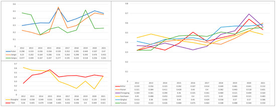 Thirdly, the forest status of Szechwan, Yunnan, Anhui, Hunan, Chongqing, and Qinghai gradually increased during the study period. The above six provinces (cities) show a relatively stable trend of forest status. Compared with the other four provinces (cities), Szechwan (0.295) and Yunnan (0.259) have a higher composite index. The main reason is that, since 2012, Szechwan and Yunnan have distributed the policy of the “Pilot Program for Sustainable Management and Management of Forest Resources in Sichuan Province” and the “Forest Land Protection and Utilization Plan for Yunnan Province (2010–2020)”. These two provinces attach great importance to the conservation and utilization of forest land and the harmonious development of economy and society. In addition, Chongqing (0.207) and Qinghai (0.103) are under greater threat due to the relative scarcity of forest resources. The measures taken to maintain the forest status in these two provinces are insufficient and can only be placed at the bottom of the overall ranking.