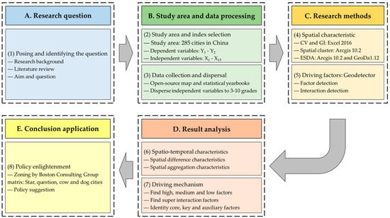 The study route in this paper consists of five steps and eight points (Figure 2). Step 1: Put forward the research questions—present the research question and research gap in this paper based on the background analysis and the literature review. Step 2: Define the study area and data processing—identify 285 cities in China as the study units, acquire the independent and dependent variables through an open-source map and statistical yearbooks, and classify the independent variables into 3–10 categories via a natural break and find the optimal classification. Step 3: Determine the research methods—perform CV and GI calculations via Excel 2016 to reflect the spatial dispersion, spatial clustering by ArcGIS 10.2 to reflect the spatial differences, ESDA analysis by Geoda 1.12 to reflect the spatial aggregation, and factor detection and interaction detection by GeoDetector to reflect the driving effects. Step 4: Conduct result analysis—reveal the spatial characteristics of public cultural facilities by differentiation analysis and aggregation analysis, recognize the core, important, and auxiliary factors of public cultural facilities by identifying the strong, medium, and weak factors, as well as the super-interaction factors, and clarify their driving mechanisms. Step 5: Practice conclusion application—delineate the policy zonings based on the Boston Consulting Group (BCG) matrix and make policy recommendations accordingly.