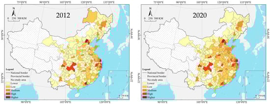 The number of public cultural facilities in the 285 cities is classified into five categories: higher, high, medium, low, and lower, via a natural break (Figure 3). It can be seen that the regional gradient difference of public cultural facilities in China is very prominent, showing a gradual decrease from east to west, and the spatial differentiation patterns of the two years have changed significantly. In 2012, higher, high, medium, low, and lower cities accounted for 1.05%, 2.46%, 8.77%, 19.30%, and 68.42%, respectively. There were a very small number of higher and high cities, including 10 cities: Beijing, Shanghai, Guangzhou, Tianjin, Hangzhou, Ningbo, Taizhou, Shenzhen, Chengdu, and Chongqing; the medium cities were scattered, including most provincial capitals and some key cities; the low cities were clustered, mainly in the Beijing-Tianjin-Hebei Region, the Yangtze River Delta, Pearl River Delta, and Shandong Peninsula, and some regions in Shanxi, Henan, Fujian, Jiangxi, and Guangxi; the lower cities were scattered in the central and western regions. In 2020, higher, high, medium, low, and lower cities accounted for 0.70%, 4.91%, 10.88%, 33.33%, and 50.18%, respectively. There were relatively few higher and high cities, mainly including the provincial capitals and some key cities in the middle east, as well as Xi’an, Chengdu, and Chongqing in the west; the medium cities were clustered, with clusters appearing in the Beijing-Tianjin-Hebei Region, Shandong Peninsula, Yangtze River Delta, Pearl River Delta, Fujian, Heilongjiang, and Jilin, as well as Nanchang and Luoyang in the central region and Kunming and Nanning in the south; the low cities were broadly expanded, mainly in most of the central regions, also including Shaanxi and Sichuan in the west; the lower cities were obviously contracted, scattered in the west and other regions, such as Heilongjiang, Jilin, and Liaoning.