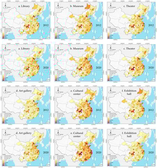 This paper chose two episodes from 2012 and 2020 for two reasons. The first reason is that the POI data for these two years are the most complete, and the second reason is that the year 2012 is typical in terms of a starting point to usher in the rapid development of public cultural facilities after the strategy of “building a cultural power“ was proposed in the “18th National Congress” report, and a series of related policies and measures were issued in the year [].