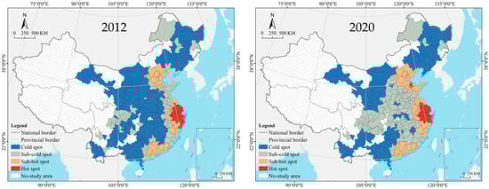 The 285 urban public cultural facilities are classified into four types: hot spot, sub-hot spot, sub-cold spot, and cold spot via a natural break (Figure 5). It can be seen that the hot spots and sub-hot spots of China’s public cultural facilities are mainly gathered in the east, covering an expanding area, while the cold spots and sub-cold spots are mainly in the central and western regions of the country, with the sub-cold spots expanding and the cold spots shrinking. In 2012, the hot, sub-hot, sub-cold, and cold spots covered 5.96%, 16.14%, 21.05%, and 56.84%, respectively, with the hot spots mainly in the core region of the Yangtze River Delta, the sub-hot spots in the Beijing-Tianjin-Hebei Region, Pearl River Delta, and the peripheral regions of the Yangtze River Delta, the sub-cold spots in some of the eastern and western regions, and the cold spots in most of the central and western regions. In 2020, hot, sub-hot, sub-cold, and cold spots covered 6.31%, 21.05%, 35.79%, and 36.84%, respectively, with the hot spots still gathered in the core area of the Yangtze River Delta, except for a few that can be found in the Shandong Peninsula, with the sub-hot spots expanding outward with continuous stretches in the Beijing-Tianjin-Hebei Region, Shandong Peninsula, and the Yangtze River Delta; the sub-cold spots expanded to the central and western regions, while the cold spots shrank and gathered in clusters in the northwest, southwest, and northeast regions.