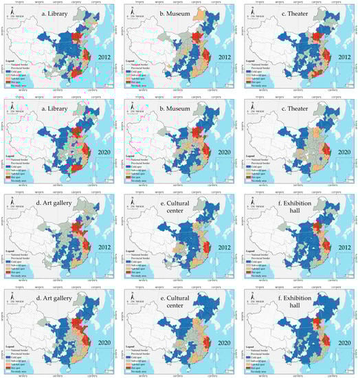 Spatial hot and cold maps of different cultural facilities in 2012 and 2020.