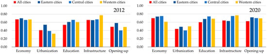 The minimum value of the driving factor in 2012 across eastern cities was 0.40, the maximum value was 0.63, and the average was 0.75, sorted as follows: . The minimum value of the driving factor in 2020 was 0.37, the maximum value was 0.78, and the average was 0.66, sorted as follows: . Total retail sales of consumer goods (), revenue from domestic and inbound tourism (), number of buses and trolley buses under operation (), and the number of subscribers to internet services () are all stable, strong factors.