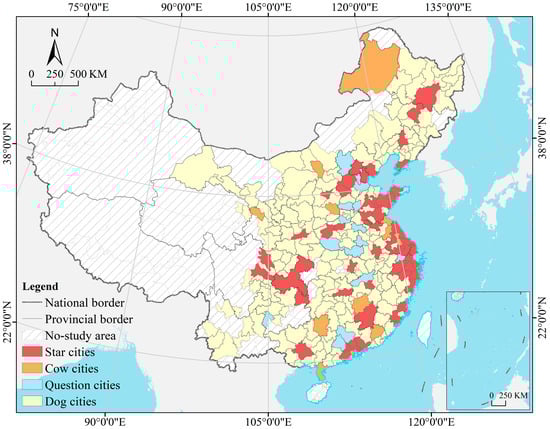 The development characteristics of public cultural facilities in China are divided into four types of star, cow, question, and dog cities based on the BCG matrix. The steps are as follows: (1) calculate the ratio between the number of public cultural facilities in each city and the largest number of public cultural facilities across cities as the horizontal co-ordinate based on the period of ; (2) calculate the normalized value of the average annual increment in public cultural facilities in each city as the vertical co-ordinate based on the growth period of ~; (3) classify the 285 cities into four categories using the average of the results of the horizontal and vertical co-ordinates as the threshold (Figure 9).