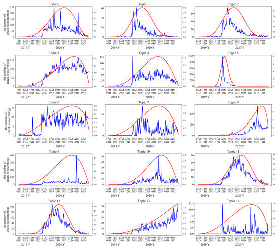 To measure the popularity of topics by the number of microblogs, we analyzed the temporal and spatial distribution characteristics of the popularity of different topics. Figure 3 shows the popular trends in topics over time. The blue curve indicates how the number of documents changes over time for different topics. The red curve is the result of the topic-time posterior probability distribution of the DMMOT model, that is, the fitted curve with a beta distribution.