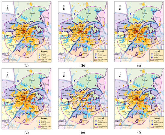 Kernel density estimation results of COVID-19-related check-in microblogs under different topic categories. (a) Topic 0; (b) Topic 1; (c) Topic 3; (d) Topic 5; (e)Topic 7; (f) Topic 9. All results were calculated with a bandwidth of 1000 m and cell size of 200 m × 200 m. The natural breaks (Jenks) method was used for hierarchical display.