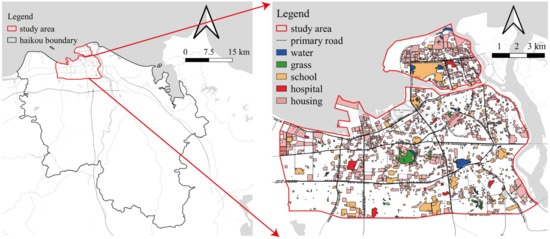 The road network data of Haikou City were obtained from OpenStreetMap (https://www.openstreetmap.org (accessed on 12 February 2020)), including the road number, road type, road name, and other attributes. Road types were categorized as primary, secondary, and tertiary roads. Data outside the study area were removed, leaving 509 rows of data for use in analyses.