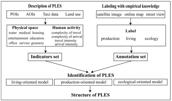 To address the biases caused by neglecting human activity and the limitations caused by the simple linear combination of indicators in the existing research on urban PLES, we first constructed a set of indicators for the description of PLES by enriching the existing indicators with human activity and AOI data. Then, the living, production, and ecological spaces were identified based on artificial empirical experience to obtain the annotation set of PLES. Finally, the random forest algorithm was applied to identify the PLES, and a comprehensive analysis of the PLES was performed based on the identification results. The workflow of the research process is shown in Figure 2.