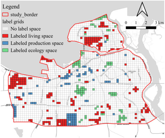 A region where a landmark is located was selected as the priority label region because we can determine the functional properties of such regions. Satellite imagery and street maps were then integrated to label the functions of the study units, thus establishing a set of labels for the identification of PLES. Figure 3 shows the labeled map, and in Table 3, we have listed some typical examples: schools, hospitals, and housing estates were labeled as living spaces because they mainly serve human activities, such as housing, medical care, and education. Woods and lakes were labeled as ecological spaces, and production workshops and commercial offices as the main workplaces were labeled as production spaces. A total of 524 grid cells were obtained for the annotation set, of which 236, 102, and 186 corresponded to living, production, and ecological spaces, respectively.