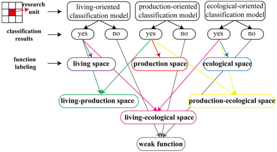 A total of 70% of each dataset was used as the training set and 30% was used as the validation set. Four important hyperparameters need to be considered in a random forest classification model, namely, indicating the number of decision trees, indicating the type of decision tree, indicating the maximum depth of the tree, and indicating the maximum number of features considered when training. The hyperparameters for each classification model are determined by a grid search method, where ranges from 10 to 200 in intervals of 20, ranges from {gini, entropy}, and and range from {3,5,7,9}. Ultimately, each grid can obtain classification results from the production-oriented, living-oriented, and ecological-oriented classification models, which are combined to form the grid’s functional labels, as shown in Figure 4.