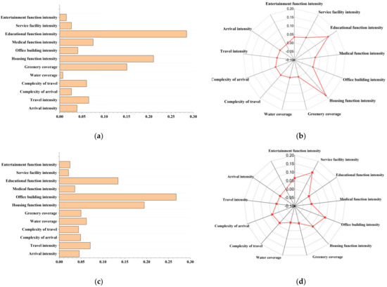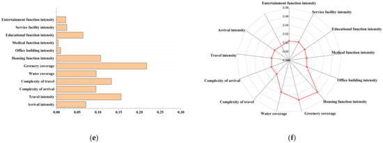 The values of housing function intensity and educational function intensity are much higher than those of the other indicators in Figure 5a, revealing the importance of these three factors for living space identification. Combined with the distribution of these three factors in Figure 5b, the definition of living space in the model can be interpreted as a place used by residents to live and receive an education. A similar phenomenon appears in Figure 5c, where only three indicators appear to be particularly important: office building intensity, housing function intensity, and educational function intensity. However, the strength of the educational function was low, as shown in Figure 5d. The resulting production spaces typically comprise clustered office buildings and fewer schools but may include residential areas. Figure 5e, showing the case with ecological space, is completely different; specifically, multiple metrics are important, but greenery coverage is extremely important. In addition, travel characteristics are highly important, but travel complexity and intensity are low (as shown in Figure 5f). This may be because we selected travel data of residents on weekdays, when people rarely visit ecological spaces. We deduced that ecological spaces refer to places where water and vegetation are located and are less visited on weekdays.