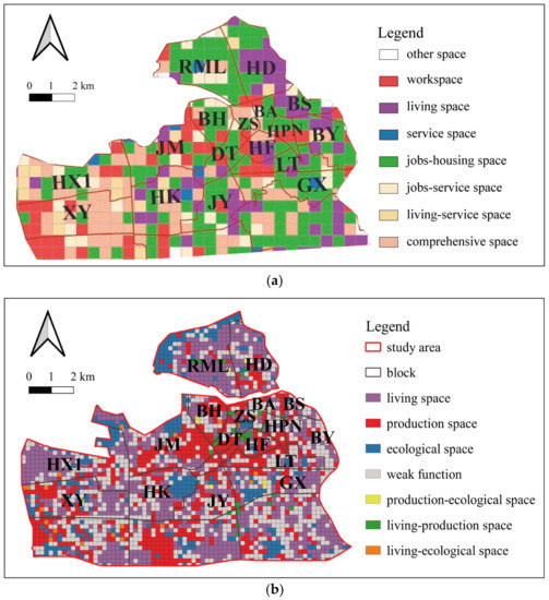 The comparison between jobs–housing space and PLES. (a) Jobs–housing space identification results of the travel flow model considering the spatial distribution of public facilities. Reproduced from Zhang et al. [30]; (b) Identification results of PLES. BS, Baisha Street; BH, Binhai Street; BA, Boai Street; BY, Binjiang Street & MeiYuan Street; DT, Datong Street; GX, Guoxing Street; HD, Haidian Street; HF, Haifu Street; HK, Haiken Street; Hx1, Haixiu Street; HPN, Hepingnan Street; JM, Jinmao Street; JY, Jinyu Street; LT, Lantian Street; RML, Renminglu Street; XY, Xiuying Street; ZS, Zhongshan Street.