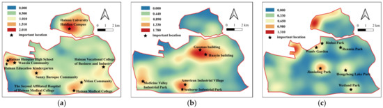 The awareness of the distribution characteristics of the three functions facilitates the development of targeted optimization policies. To this end, we computed kernel density estimates for the living space, production space, and ecological space, the results of which are shown in Figure 8. The living spaces in the main urban areas of Haikou show a well-defined circular structure, with low-density and scattered areas in the center and patches of high-density areas in the periphery. A comparison with real-world maps reveals that high-density living areas are usually located around schools, such as Hainan University, Hainan Overseas Chinese High School, and Hainan Ninth Primary School, suggesting that the construction of educational resources can promote the formation of urban living space clusters. Production space gathers towards the southwest, mainly formed around industrial parks in the southwest (e.g., Yakult Industrial Park, Haima Industrial Park) and office clusters in the center (e.g., Huayin Building and China World Trade Center), with this layout probably resulting in long-distance commuting within the city. The ecological space shows a sparse dotted distribution, mostly in park-based scenic areas such as Jinniuling Park and Wetland Park, indicative of a lack of green space in terms of residential areas and industrial estates. The Haikou government needs to promote a balanced layout of educational resources and industrial clusters, as well as to improve residents’ well-being by increasing vegetation cover in the vicinity of residential areas and industrial parks.