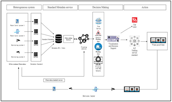 To enhance the development of immediate response mechanisms to disasters, the massive deployment of sensors based on IoT technology can be of substantial benefit. For example, in the case of flooding, it is ideal to understand the locations and parameters of flood sensors and Closed-Circuit Television (CCTV) completely, deployed by multidisciplinary units. Despite the rapid development of Internet technology, challenges remain, including a lack of effective control of the resources managed by each unit, heterogeneity of the framework structure, and inconsistent service interfaces. Rather than dedicated response systems specifically developed by the individual agency for its responsible missions, this study focuses on overcoming the major barriers to cross-domain resource sharing from a standardized perspective and proposes a metadata-based approach to facilitate the sharing and interoperability of disaster information for emergency response. Figure 1 shows the major components of the proposed architecture.
