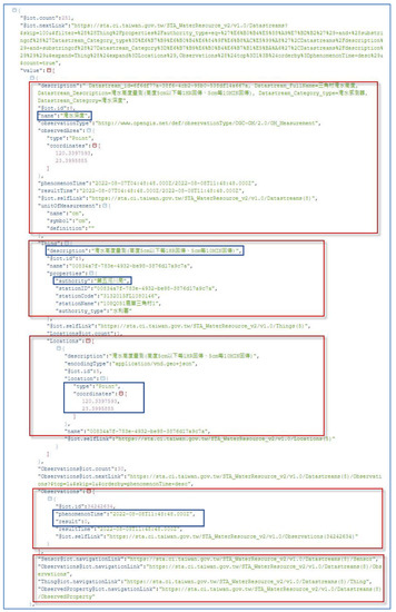 Flood sensor information and inundation depth sensing data from the Water Resources: Department of Taiwan’s Civil IoT Taiwan of Things SensorThings API Service. URL source: https://tinyurl.com/mvu4f893 (accessed on 8 April 2023, using the shorten URL tool). The Chinese in the figure represents the metadata elements: “name: flooding depth”, “description: flood height measurement the height below five centimeters returns every hour, five centimeters return every ten minutes”, “authority: The 5th River Management Office”.