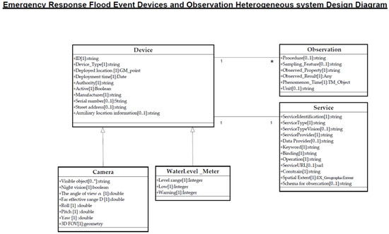 This paper proposes a set of metadata elements to facilitate the collaborative mechanism of distributed sensor systems. Standardized metadata were developed to include all the required information for decision makers to search for and select suitable services and obtain observations as a reference for response actions. Ideally, all sensor systems should follow a consensus standard for preparing and registering metadata in a resource management system. Figure 3 illustrates the metadata design results using a unified modeling language (UML). Three main components—devices, observations, and services—are considered.