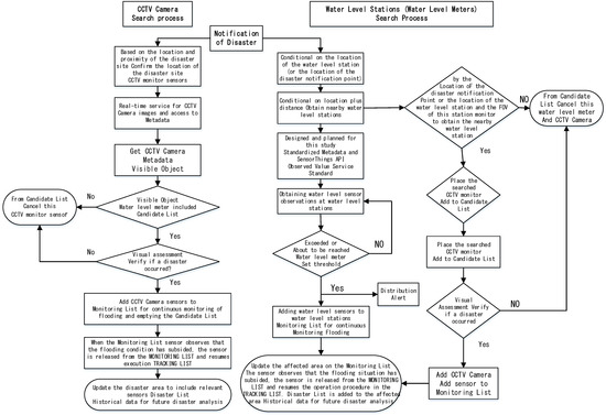 - Monitoring list: When a sensor is added to the monitoring list, it implies that a disaster is confirmed according to its acquired observations; for example, a water level meter that exceeds the alert threshold or a CCTV streaming service that shows the occurrence of a disaster. The monitoring list must be updated continuously until the threat ends.
