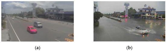 (a) CCTV recording for monitoring traffic. URL source: https://ocam.live/index.php?route=product/product&product_id=6745 (accessed on 1 July 2022) (b) CCTV recording showing flooding in a local area (accessed on 28 August 2018).