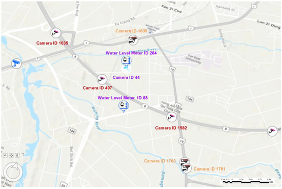 The experimental area was located in the Sinshih District of Tainan City. Nine sensors, including seven CCTV cameras and two water-level meters, were deployed by three government agencies, as discussed below.