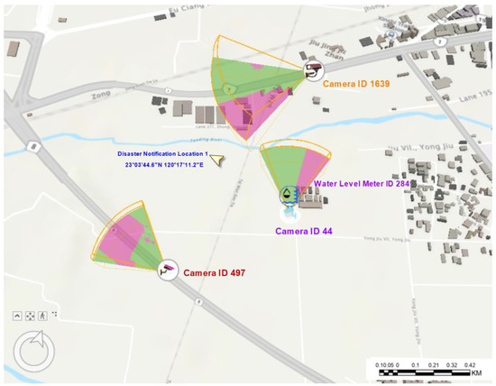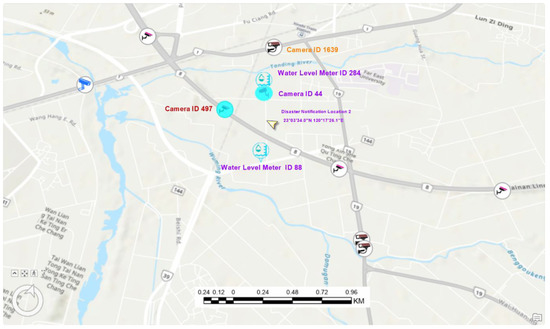 - From the map-based interface, only a portion of the experimental area is covered by the three cameras; there is no overlap among their coverage areas, and the commander knows which area they will be supplied with continuously updated information. The recorded information of every camera in the candidate list must be visually inspected to determine whether there is a flood in the coverage area. For the three elements of the designed metadata elements, “ServiceURL”, “Operation”, and “observation”, the URLs are used for establishing the required link (for example, the URL for the camera with ID 1639 is https://cctv-ss06.thb.gov.tw:443/T1-321K+710(S)/snapshot. accessed on 6 July 2023). If a flood was visually confirmed from the acquired image, the corresponding CCTV image was added to the monitoring list. In this example, although the location of the reported disaster is not visible, we assume that the disaster was visually confirmed in all three CCTVs; therefore, all of them are added to the monitoring list.
