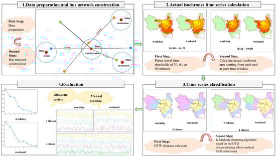 Our place-centered accessibility time series grouping method with bus FCD contained four steps: data preparation and bus network construction, actual isochrone time series calculation, time series grouping, and validation (Figure 1).