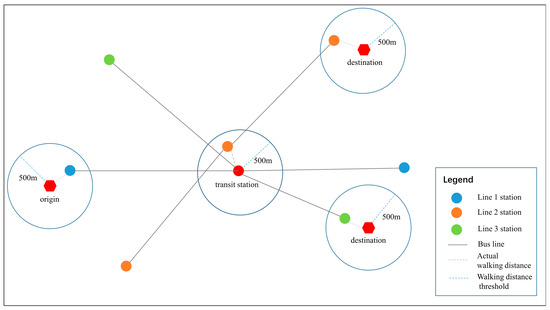The schematic diagram of bus network construction with a 500 m between-station transit threshold.