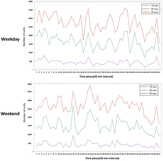 Figure 4 presents two isochrone maps, one for a weekday and another for a weekend, starting from one hexagonal unit. The resulting time series of accessibility values for this hexagonal unit is presented in Figure 5, which shows the 30, 60, and 90 min isochrone areas. The isochrone-based accessibility time series displays a fluctuation pattern that cannot be fully explained by peak and leisure times alone. While there were peak time windows in the morning, at noon, and in the late afternoon when accessibility declines, accessibility during most of the peak hours was not significantly lower than during leisure hours. An analysis of the bus FCD indicated that there were more active bus vehicles and lower bus arrival intervals during peak times compared to leisure times, which may explain why accessibility was not significantly lower during peak hours. However, once those extra peak hour buses arrived at their destination station, there was an immediate accessibility decline. Additionally, the bus service interval increase could explain the accessibility decline at noon when traffic conditions were not compromised. Weekend accessibility, with an average of 1435 units for the 90 min isochrone, was slightly lower than that of the weekday at 1493. However, their time series patterns were significantly different, as shown in Figure 5.