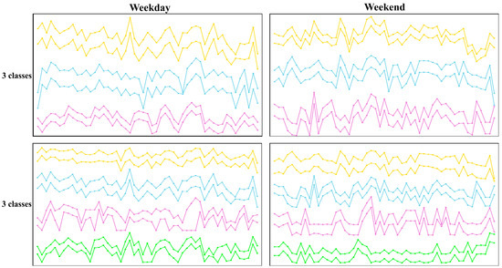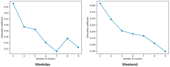 Figure 6 displays the sum of distance within classes as the classification number K increases. Figure 7 shows the silhouette score as K increases. The elbow method suggested an optimized K of 5 or 6, despite the elbow point in the diagram being vague. On the other hand, the silhouette score indicated 3 to be the best. The literature suggests that the silhouette score often performs best when evaluating cluster metrics [56,57]. The silhouette score for three class classifications was approximately 0.3, which is considered fair. Furthermore, we manually compared the time series diagrams of different classes and concluded that three classes were the best to account for the main time series classes and largely prevented overlapping between classes. The result of four classes was also presented as a reference, and Figure 8 shows two time series in each group with three and four classes on both weekdays and weekends. The time series is vertically offset from its original y-value in order to be presented together. Despite there being no dramatic time series shape difference, the time series shape of different classes in the three class classifications was distinguishable, but the shape differences in some patterns from different classes in the four class classifications for weekdays were not as obvious. The mean and median accessibility of each class were also significantly different, as shown in Table 1, which presents the all-day average accessibility for each class in the three class classifications.
