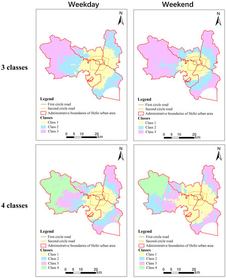 Plotting hexagonal units with classes as different categories and with different colors revealed clear spatial patterns (Figure 9). These patterns differed from those of the whole-day median accessibility (Figure 10). The hexagonal units in class 1 compose a continuous surface in the city center, which is encircled by the first and second circle freeways. Moreover, class 2 encircles class 1, and class 3 encircles class 2. This pattern clearly indicates that the city center, suburbs, and outskirts have different accessibility time series features. Class 1 in the city center generally had a higher average accessibility evaluated by 30, 60, and 90 min isochrones, and it also presented different dynamic patterns, such as a clear accessibility peak at noon, while the other two classes did not. The city center, suburbs, and outskirts may exhibit distinct demographic characteristics, bus service provisions, and network profiles. These factors collectively contribute to the variations in accessibility time series features. Linear features were observed on the map, particularly towards the west direction, coinciding with two main routes where many bus stations are located. Holes within the continuous surface of class 1 can be explained by special ground situations, such as mountains, parks, and industrial fields, where both bus stations and bus lines are sparse. The four-class classification also presented some detailed spatial features of the suburban region. A noteworthy finding of the four-class classification was that the classification of weekdays and weekends differed significantly in the southwest part of the city. During the weekend, classes 2 and 3 no longer followed circular patterns. Unlike the continuous class 1, which remained in the city center during weekends, classes 2 and 3 were interwoven with both line and hole regions.