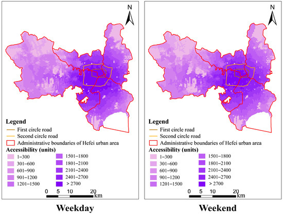 Comparison of whole-day median accessibility between weekday and weekend.