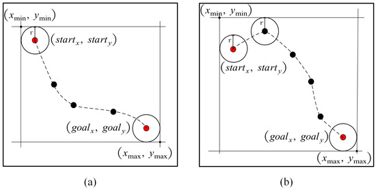 Determination of the search area: (a) search area determined by the starting point and target point; (b) search area determined together by the starting point, target point, and other auxiliary edge points.