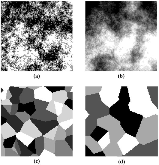 Examples of (a,b) cloudy cost surfaces and (c,d) patchy cost surfaces: (a) 4 classes, (b) 10 classes, (c) 7 classes, and (d) 4 classes. Darker shades represent higher values.