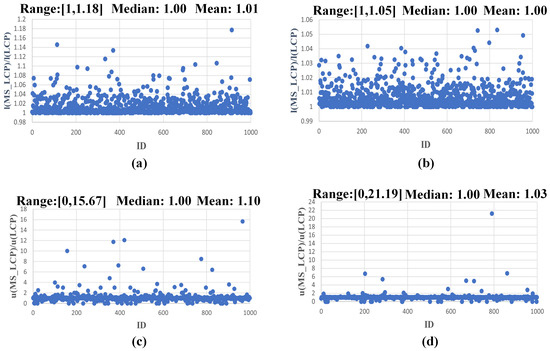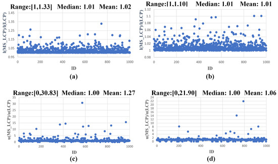 Figure 6 and Figure 7 illustrate visualization results of 1000 data points in the dimensions of l(MS-LCP)/l(LCP) and u(MS-LCP)/u(LCP), respectively. The corresponding ranges, medians, and averages are labeled. It should be noted that for each set of data, the total length of the path in 80% of the MS-LCP results is only slightly different from that of the LCP. The averages and medians are both close to one, and the value range is [1, 1.33]. The u(MS-LCP)/u(LCP) dimension has value ranges of [0, 15.67], [0, 21.19], [0, 30.83], and [0, 21.90]. Additionally, there are cases where the length of the intersection between the maximum downsampled MS-LCP and the “undesirable” cell exceeds the average downsampled MS-LCP.