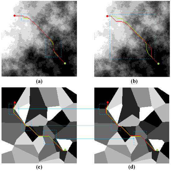 After obtaining the coordinates of appropriate path directional points, they are then mapped to a high-resolution raster. With a downsampling coefficient of 2:1 and using the averaging method, the row and column of a certain cell on the low-resolution raster are denoted as , which correspond to , , , and on the high-resolution raster. If the path directional points are the starting and target point, they are mapped directly to the starting and target points of the high-resolution raster. For other directional points, the point with the minimum cost among the four located on the high-resolution raster is chosen.
