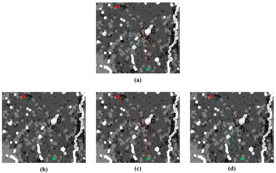 Path search results were obtained for both the traditional LCP method and the proposed MS-LCP method using real terrain data. Different starting and target points were randomly selected for each set. Table 6 and Table 7 display the ratios of l(MS-LCP)/l(LCP) and u(MS-LCP)/u(LCP) for the 1000 datasets under each downsampling methods, along with the corresponding ranges, medians, and means. Figure 9 illustrates the paths that correspond to the results mentioned above.