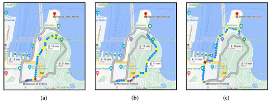 Figure 1 represents the shortest route (a) and alternative routes (b,c) between the “Museum of Sydney” and the “Sydney Opera House” suggested by Google Maps. It can be seen that despite showing small differences in the distance (850 m, 950 m, and 1 km) and travel time (10 min, 11 min, and 12 min), the routes have quite different geometric properties. In such situations, while many pedestrians generally ask “which path takes me to the destination faster?”, others might consider different factors that are directly or indirectly relevant to the geometry of the route as follows: