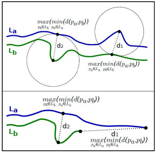 Let and be two lines. Among all points of , the point with the furthest distance from is defined as . Then, among all points, the point having the closest distance to is defined as . Let be the distance between and . Furthermore, can be determined by reversing the roles of and . Consequently, the Hausdorff distance equals to . As illustrated in Figure 3, two compared lines must have almost similar traces and shapes (top-side). Otherwise, the Hausdorff distance is not an ideal indicator of similarity (bottom-side) [56]. If is a small value, and are partially matched, and vice versa. In case is equal to zero, and are exactly matched [49].