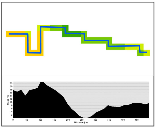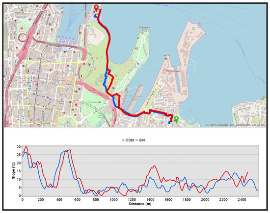 Figure 7 presents the calculated shortest paths with road slope profiles between “Elizabeth Bay House” and “Sydney Opera House” locations. According to Table 5, OSM and Google Maps routes were remarkably similar in geometry, with a dissimilarity ratio of about 4%. The remaining statistics shown in Table 6 indicate that the OSM route offers more comfort, convenience, and safety than Google Maps, given that it is less tortuous and pedestrians can expect smoother motion and better accessibility due to its lower average and maximum slopes.