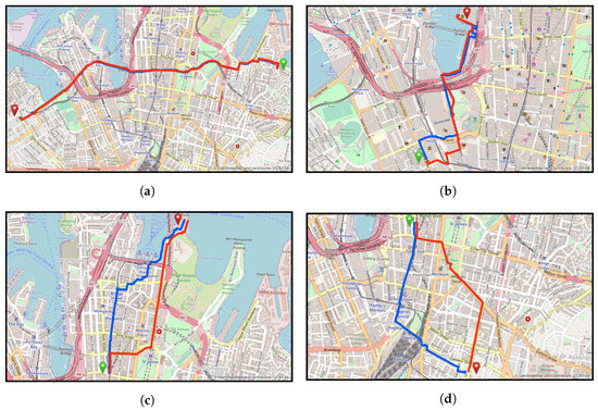 Figure 8 presents four route pairs grouped under different similarity clusters, and Table 8 provides information on their main characteristics. According to Figure 8a, the OSM route for “Elizabeth Bay House” to “Glebe Library” fully overlapped the Google Maps route by achieving a 40 m Hausdorff distance and a dissimilarity ratio of 0.87%. Despite deviations up to 157 m, the OSM route for “Powerhouse Museum” to “WILD LIFE Sydney Zoo” reached a 10.47% dissimilarity ratio as it was almost identical for most of the path (Figure 8b). On the contrary, two OSM routes originating from the “Queen Victoria Building” to destinations “Sydney Opera House” (Figure 8c) and “Surry Hills Library” (Figure 8d) were dissimilar to Google Maps, accounting for 20.87% and 37.56%.