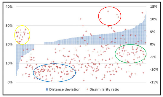 Figure 9 illustrates the relationship between the similarity of route pairs and their length deviation. The OSM shortest paths classified as well matched mainly concentrated between 0 and up to nearly 3% divergence from Google Maps (blue oval). A higher frequency of moderately matched occurrences was observed for OSM longer distances than Google Maps, with a maximum of 14.5% (green oval). The OSM routes shorter than Google Maps were mainly classified under the slightly matched cluster (yellow oval). Lastly, the red oval shows that all the non-matched routes occurred in the positive area of the plot.