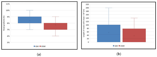 According to Figure 11a, while the average road gradients were mainly between 7 and 9%, Google Maps experienced longer roads up to nearly 200 m with very steep slopes, which is more challenging to move than OSM for wheelchair users and older adults (Figure 11b).