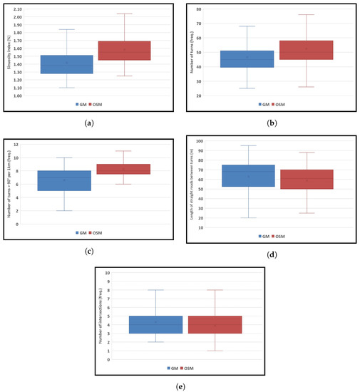 According to Table 9, on average, Google Maps witnessed straighter route geometry than OSM, achieving an average sinuosity index of nearly 1.41% versus 1.58%. The routes with a sinuosity index of over 1.8 could be challenging to walk. The Spearman’s rank correlation indicates a significant association between the sinuosity index and route length, (758) = 0.92, p < 0.001. Therefore, with an increase/decrease in route curviness, there is expected to be an increase/decrease in route length. Similarly, fewer road turns existed on Google Maps routes than OSM ones and, consequently, longer straight lines between each turn. On the other hand, OSM showed fewer intersections and lower average and maximum slopes than Google Maps.