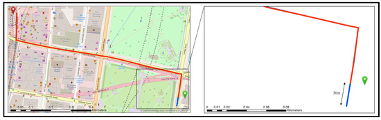 Figure 13. An example of the starting/ending edge problem (blue line: OSM, red line: Google Maps, black line: starting edge of the route, green/red placemark: origin/destination). - Utilized routing algorithmAlthough both web mapping services use Dijkstra’s algorithm to calculate the shortest path between points A and B, the OSRM’s algorithm is a modified version of Dijkstra, namely, “MultiLevel Dijkstra (MLD)”, which works on the overlay graph (i.e., an approximation of the original graph with a reduced complexity) produced by a partitioning step. This could result in negligible differences in the lengths of the calculated routes.