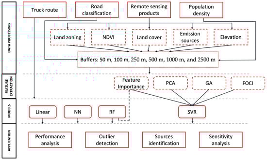 The general structure of the workflow of this work is summarized in Figure 1 below. We utilize multiple datasets including various remote sensing products to calculate the independent land use variables as input for air pollution estimation models. Four machine learning and deep learning models are carefully tuned with comprehensive feature selection and dimension reduction techniques to improve computational efficiency and model performance. We identify the major sources contributing to ambient air pollution concentrations and the hyper-local outliers based on the models’ estimation results.