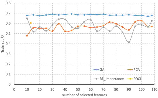 FOCI calculates conditional dependence coefficients based on the predictive power to select a subset of input features, which is a forward stepwise feature selection method []. The RF model uses regression trees to make predictions, which can also calculate the relative importance of each input feature. Based on this relative feature importance, we can subset different numbers of features as input for the SVR model. The GA-based method is uniquely designed to select optimized feature combinations and SVR model hyper-parameters, concurrently [].